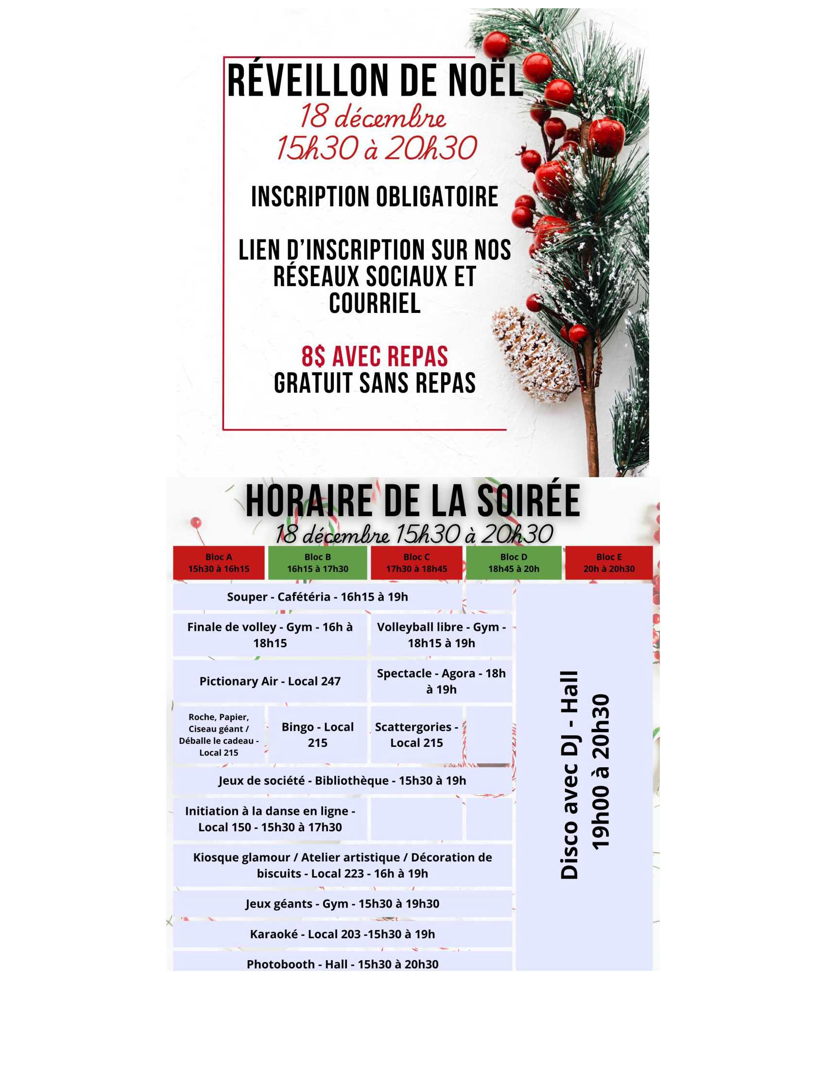 Prix de présence parmi tous ceux inscrits et présents lors du tirage qui aura lieu en fin de soirée. Un repas sera offert : Pizza-ghetti avec option végétarienne, dessert de Noël et breuvage pour un montant de 8 $. La date limite pour s’inscrire est le vendredi 28 novembre à 16h30 en remplissant ce formulaire et en effectuant le paiement, s'il y a lieu, auprès du bureau de la vie étudiante en argent comptant ou par carte de débit.